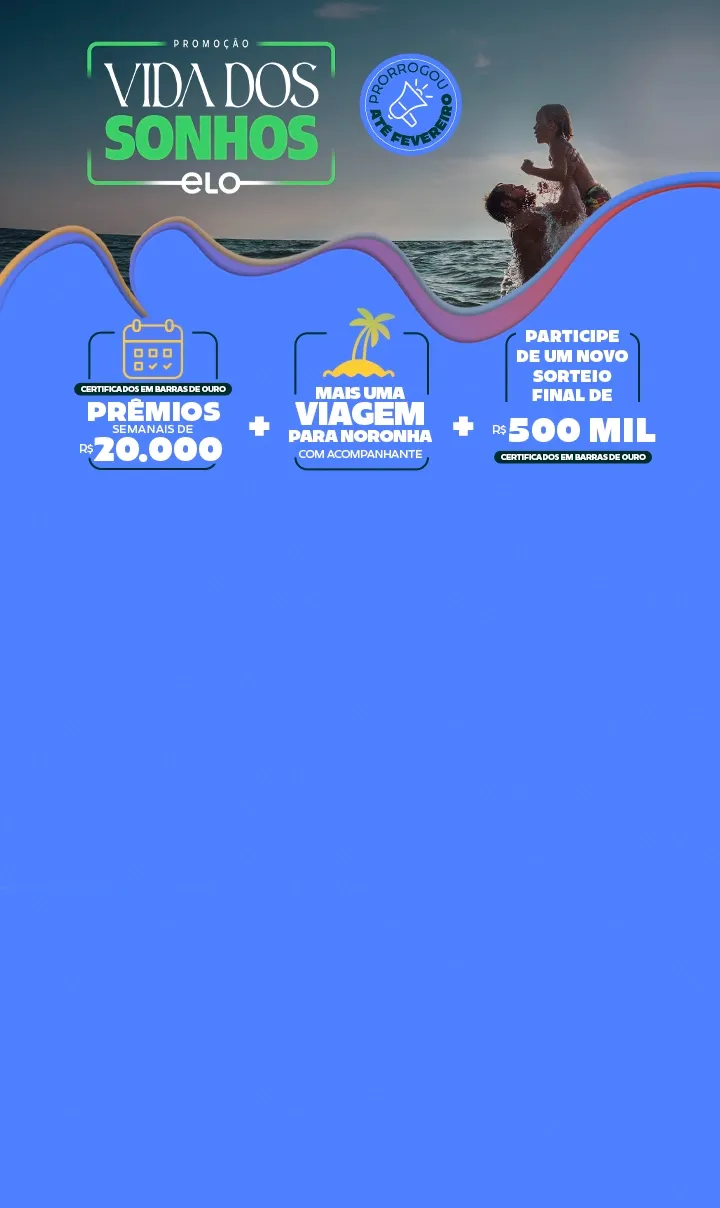 Promoção válida para transações efetuadas em cartões cadastrados de 10.03.2025 a 22.02.2026. Consulte condições de participação e regulamento no site elo.com.br/vidadossonhos. CA SPA-MF SPA/ME nº 04.040017/2025. Imagens meramente ilustrativas.